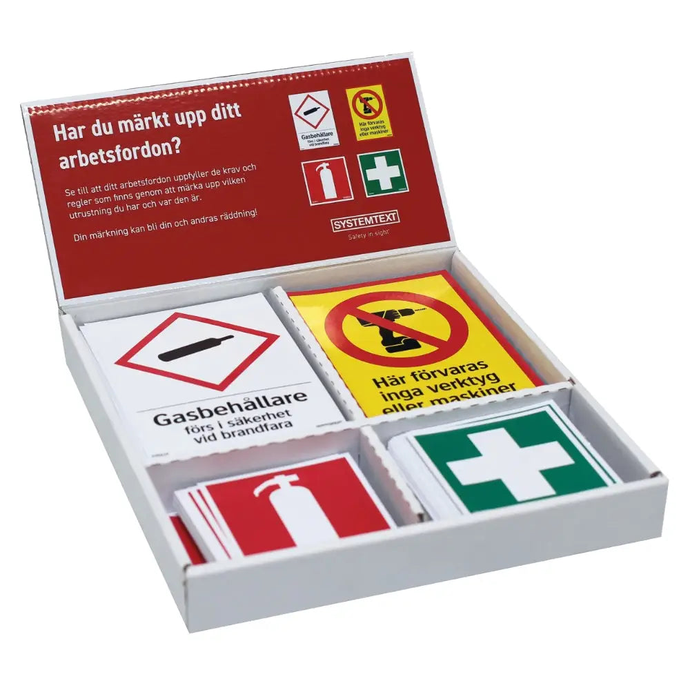 Bordsdisplay (multipack) med dekaler för märkning av arbetsfordon. Lådan innehåller fyra olika dekaler för att enkelt märka upp vilken utrustning som finns i bilen och passar perfekt som butiksdisplay på exempelvis kassadisken. Genom rätt märkning kan vi rädda liv.