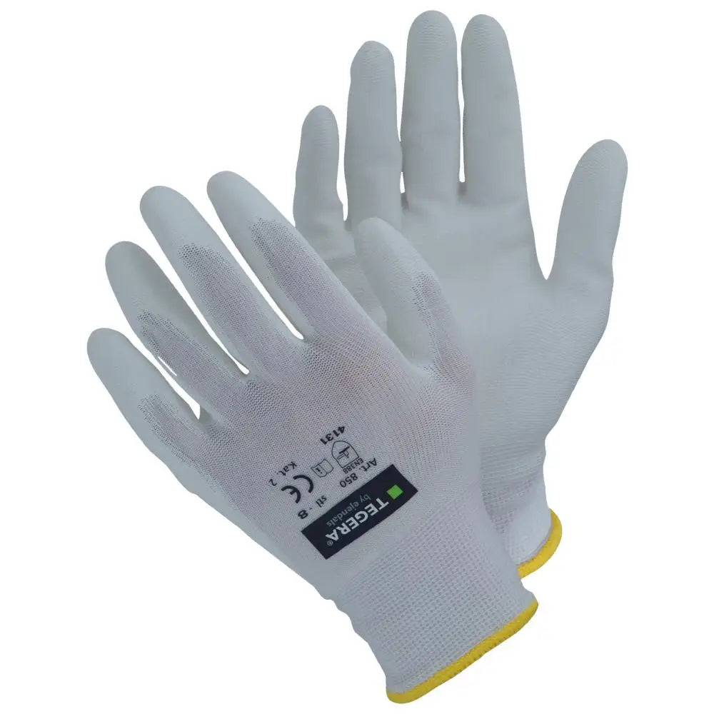 En handske för dig som arbetar i smutsiga och oljiga miljöer och behöver högsta smidighet och fingertoppskänsla, exempelvis vid monteringsarbeten. Tegera 850 är en smidig, kort nylonvante i vitt med mycket bra passform. Innerhanden och fingertopparna är doppade i PU, som ger ett mycket bra grepp och skyddar mot oljor, vissa kemikalier och genomstickning. Handsken är sanitized-behandlad, vilket förhindrar svamp- och bakterietillväxt. En stickad mudd runt handleden håller handsken bekvämt på plats. En handske som låter dig arbeta helt obehindrat. Den är även silikon- och kromfri för dig med känslig hud. Material: PU-doppad nylon. Kvalité: Högsta kvalitet. Färg: Vit. Familj: Tegera Basic. Funktioner: Tät innerhand, silikonfri, ventilerad ovanhand, mudd, handflatedoppad, tvättbar i 40° C maskintvätt. CE-godkänd. Kat. II EN 388 4131.