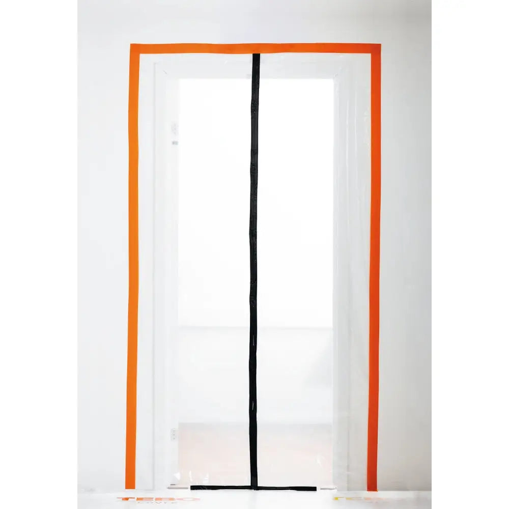 Dammskydd av HDPE-plast för täckning av dörröppningar vid t.ex. renovering. En rak öppning ända ner till golvet som enkelt öppnas och sedan stängs automatiskt tack vare magneter. Fästs med tejp.