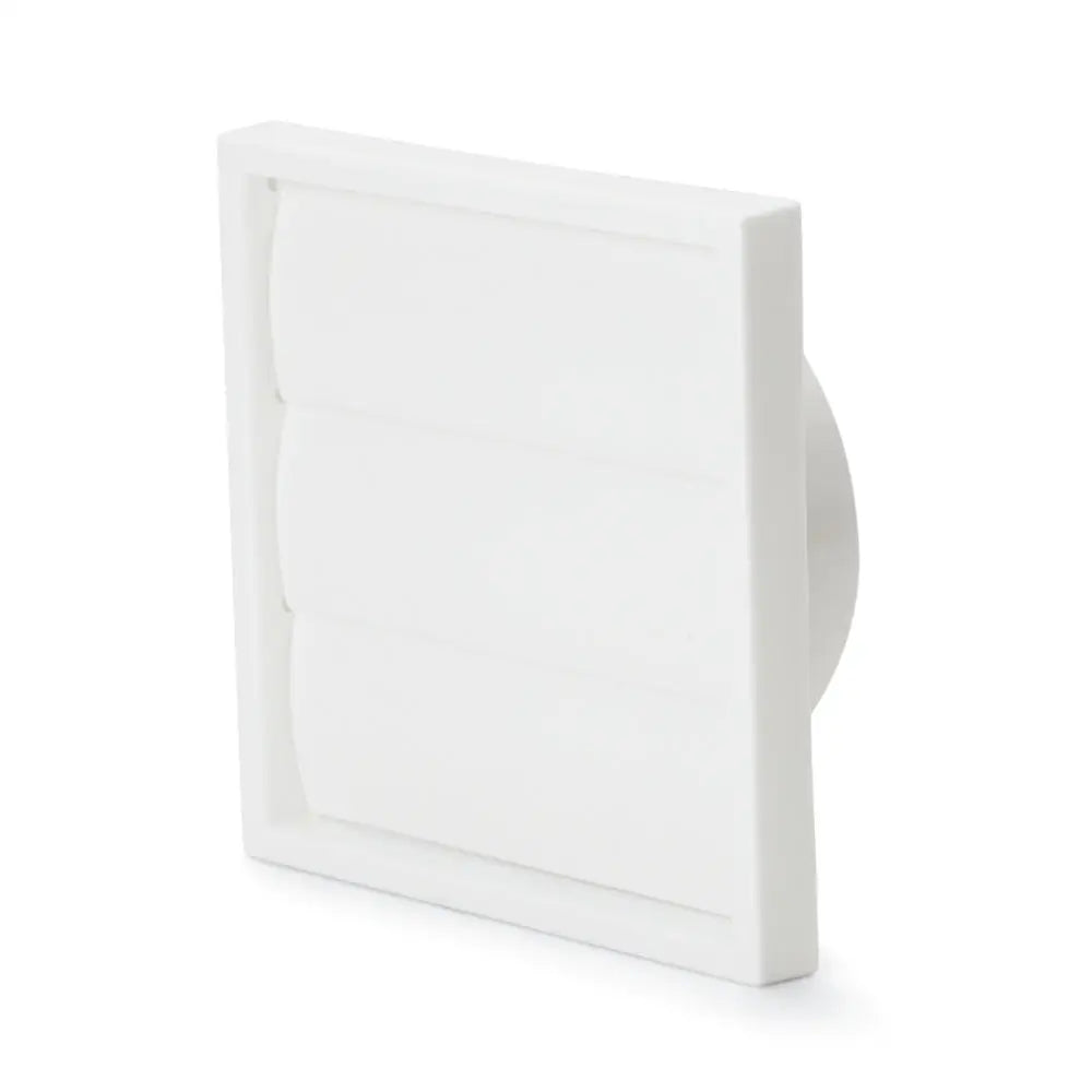 Jalusigaller #150 med Ø100 mm stos. Material: vit polysterene plast. Utvändigt mått: 154x154x45 mm.