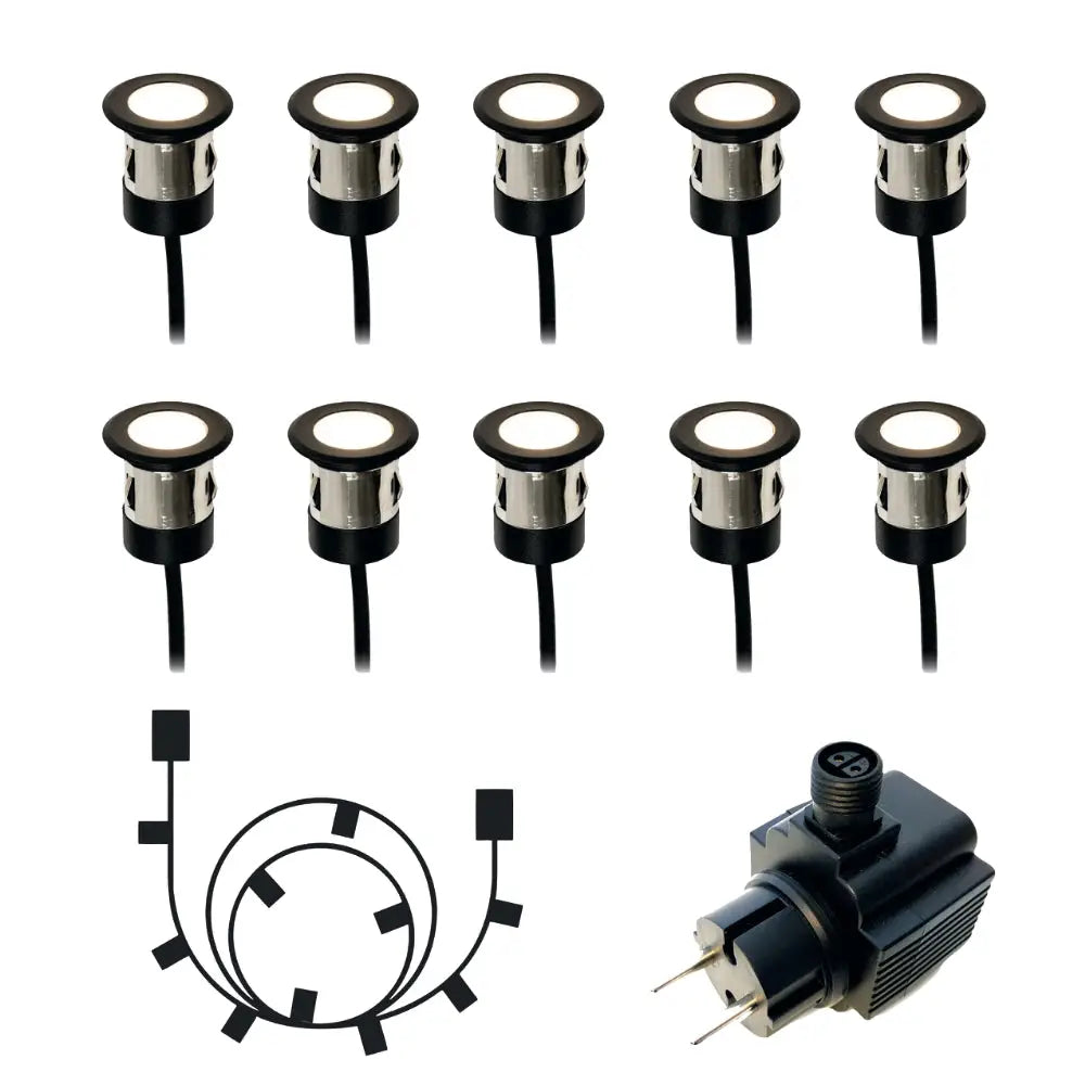 Komplett paket med 10 st decklights. Inkl 21 watts transformator anpassad för antalet lampor, samt 1 st grenkabel tio meter. Nättare decklight för infällning i altan, stensättning eller längs en gång. Kan även användas som markör vid trappsteg eller som avslut på en nivå i trädgården. IP-klassning IP65.
