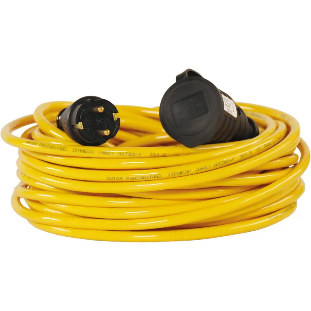 Skarvkabel PUR 16A/230V. Polyuretanmantlad kabel är avsedd som förbindnings- och anslutningskablar för höga mekaniska belastningarvid industriell drift med nötande påfrestningar t ex industri och jordbruk. Den fungerar även bra då höga krav på beständighet motkemiska lösningsmedel och oljor ställs. Är mycket lämplig för utomhusbruk, till exempel vid industriell drift och på byggarbetsplatser med låga temperaturer. Även lämplig för tung industri, verkstäder och gruvor. Monterad med slagtåliga, oljebeständiga uttagsdon. Godkänd för utomhusbruk.