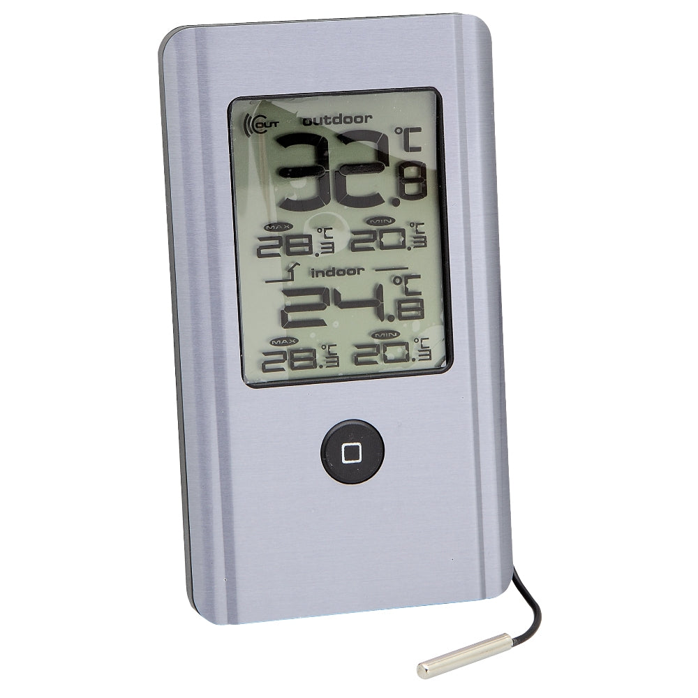 Inne- och utetermometer med min/max. Mätområde inne -10° till +50°C, ute -40° till +70°C. Min/max temperaturerna visas tillsammans med aktuell temperatur i displayen. Mäter högsta och lägsta temperatur. Aluminium front. Monterbar på vägg. Utfällbart bordstativ medföljer. Drivs med 2 st LR03/AAA batterier. Batterier medföljer ej.