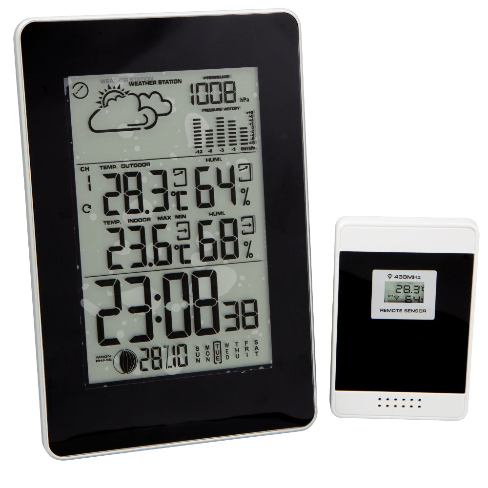 Trådlös väderstation med barometer. Mäter och visar ute- och innetemperaturen. Mäter och visar luftfuktighet inomhus och utomhus i procent. Mäter och visar historik över lufttrycket med stapeldiagram. Utomhus temperatur: upp till 3 sensorer. Visar datum/kalender/veckodag. Visar lufttryck i Hpa eller inHg. Visar väderprognos med olika symboler: soligt, växlande, molnigt och regn. Temperaturen visas i Celsius eller Farenheit. Ett knapptryck för belyst display. Överföringsräckvidd: 80 meter. Huvudenheten drivs med: 2 st LR6/AA batterier. Sändaren drivs med: 2 st LR03/AAA batterier. Batterier medföljer ej.