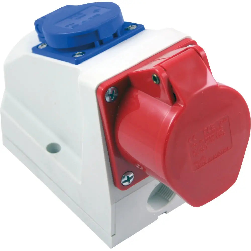 Vägguttag CEE. Med kabelgenomgång upp- och nedtill. Förkopplad med kopplingsplint samt 230V uttag. Självstängande lock. Uttagsdon för väggmontage PCE. Tillverkade i Polyamid 6 vilket är resistent mot syror och alkalier, samtidigt som materialet är mycket slagfast. Självstängande lock. Godkänt för utomhusbruk IP 44. Lämpliga för industrier verkstäder, byggarbetsplatser och lantbruk.
