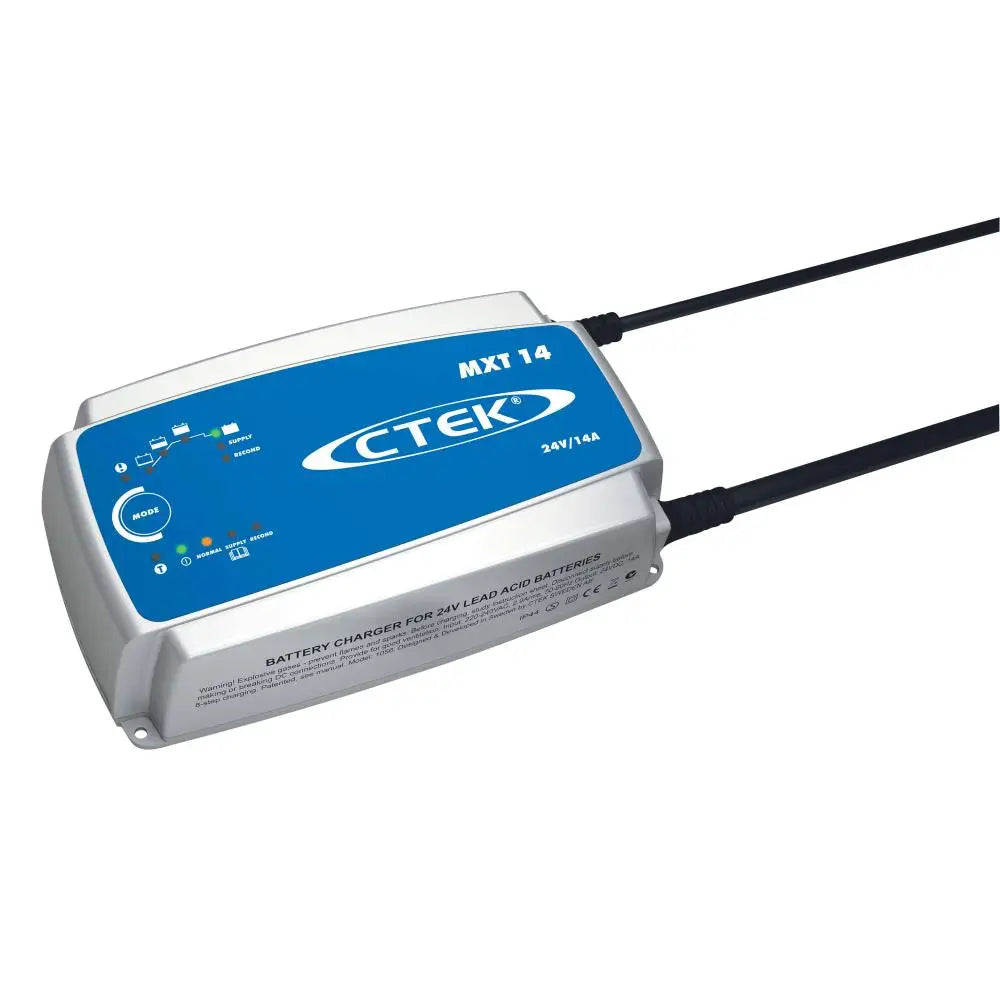 MXT 14 är en proffsladdare för 24 V. Den är utvecklad för fordon i yrkestrafik där batterierna utsätts för stora påfrestningar och är idealisk i bussar, lastbilar och för verkstäder för tunga fordon. MXT 14 har alla egenskaper och funktioner som löser många olika batterirelaterade problem. Den har funktioner som undersöker och visar om batteriet kan laddas och bibehålla laddning, en speciell rekonditioneringsfunktion som återställer skiktade och djupt urladdade batterier, unik underhållsladdning samt en temperaturgivare för optimerad laddning oavsett väderförhållandena. Laddaren har också en matningsfunktion så att batteriet kan kopplas bort från fordonet utan att viktiga inställningar går förlorade. MXT 14 är en helautomatisk 8-stegsladdare som ger 14 A för 24 V-batterier mellan 28 och 300 Ah och den lämpar sig väl för underhållsladdning upp till 500 Ah. Laddaren är IP44-klassad (användning utomhus), skyddar fordonselektroniken, bildar inga gnistor och är polaritetsskyddad och kortslutningssäker. Den levereras med 2 års garanti.