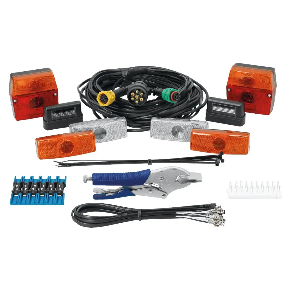 Komplett belysningskit för släpvagnar som innehåller allt du behöver för att uppdatera och förbättra belysningen på din släpvagn. Kitet levereras med baklampor, sidomarkeringsljus, positionsljus, nummerskyltsbelysning, samt en huvudkabel på 7,1 meter. Dessutom ingår smartclips för DC-kabel, smartkabel, smartclipstång och buntband för en enkel installation. Allt du behöver för att säkerställa korrekt och långvarig belysning på din släpvagn.