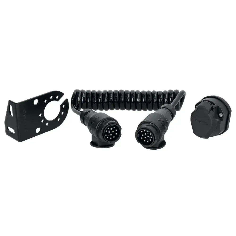 Kit med hållare, stickdosa och 13-polig spiralkabel. Hållaren skruvas enkelt fast på släpvagn och stickdosan monteras säkert i hållaren för en mer hållbar lösning. Fäst sedan spiralkabeln i stickdosan för optimal prestanda och säkerhet.