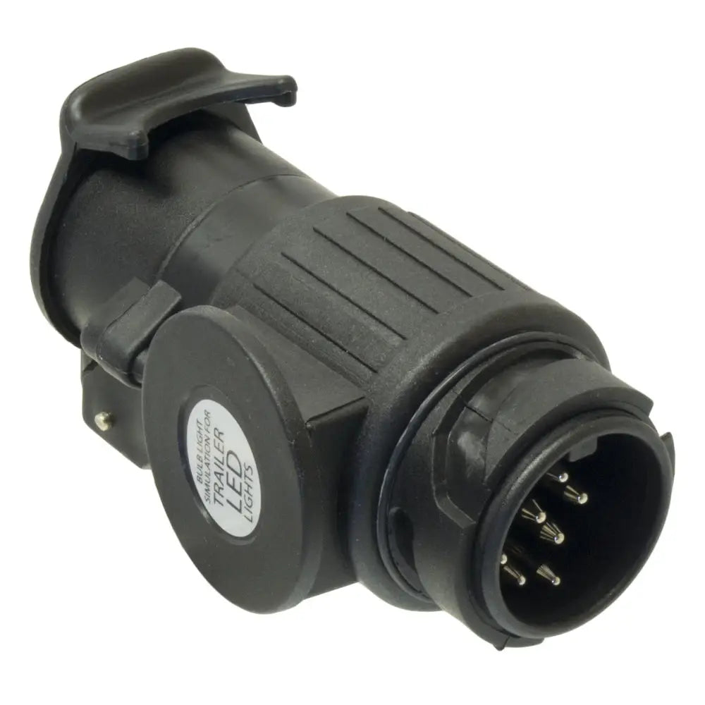 Kopplar 13-polig kontaktdosa på bilen till 7-polig släpvagnskontakt. Simulerar glödlampors egenskaper för att åtgärda problem med LED-lampor på släpet. Förhindrar felaktiga felmeddelanden vid låg strömförbrukning. Bibehåller funktionaliteten för bakljus, blinkers och bromslyktor trots LED-lampor. Löser problem där LED-lampor blinkar eller inte fungerar korrekt på grund av bilens kontrollsignaler.