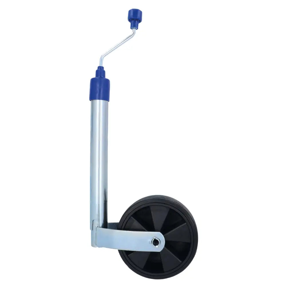 Stödhjul. Ø48 mm svart plastfälg. Fullgummihjul för att undvika punktering 215x70 mm. Belastningskapacitet: 150 kg. Blå gummihätta på stången för att förhindra att vatten och smuts tränger in.