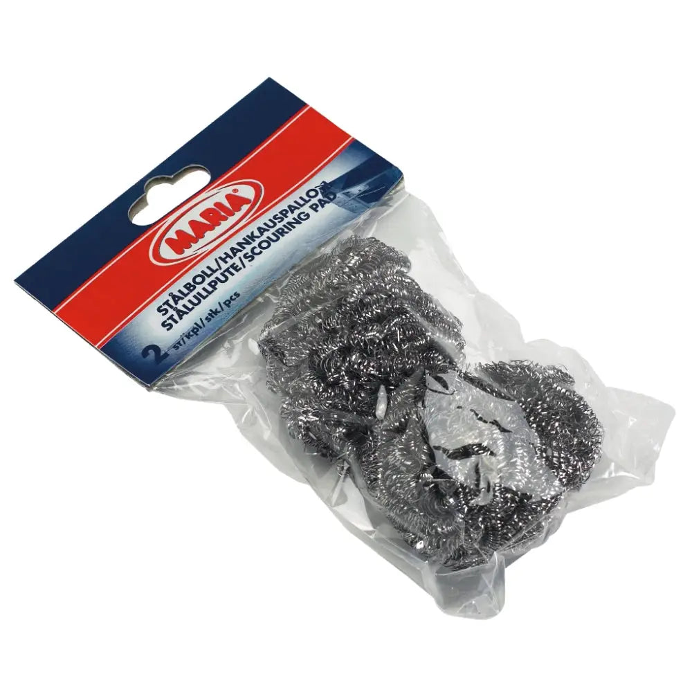 Stålboll Maria är en slitstark rengöringsboll i rostfritt stål, perfekt för att avlägsna fastbrända matrester och smuts från kastruller, stekpannor och andra köksredskap.