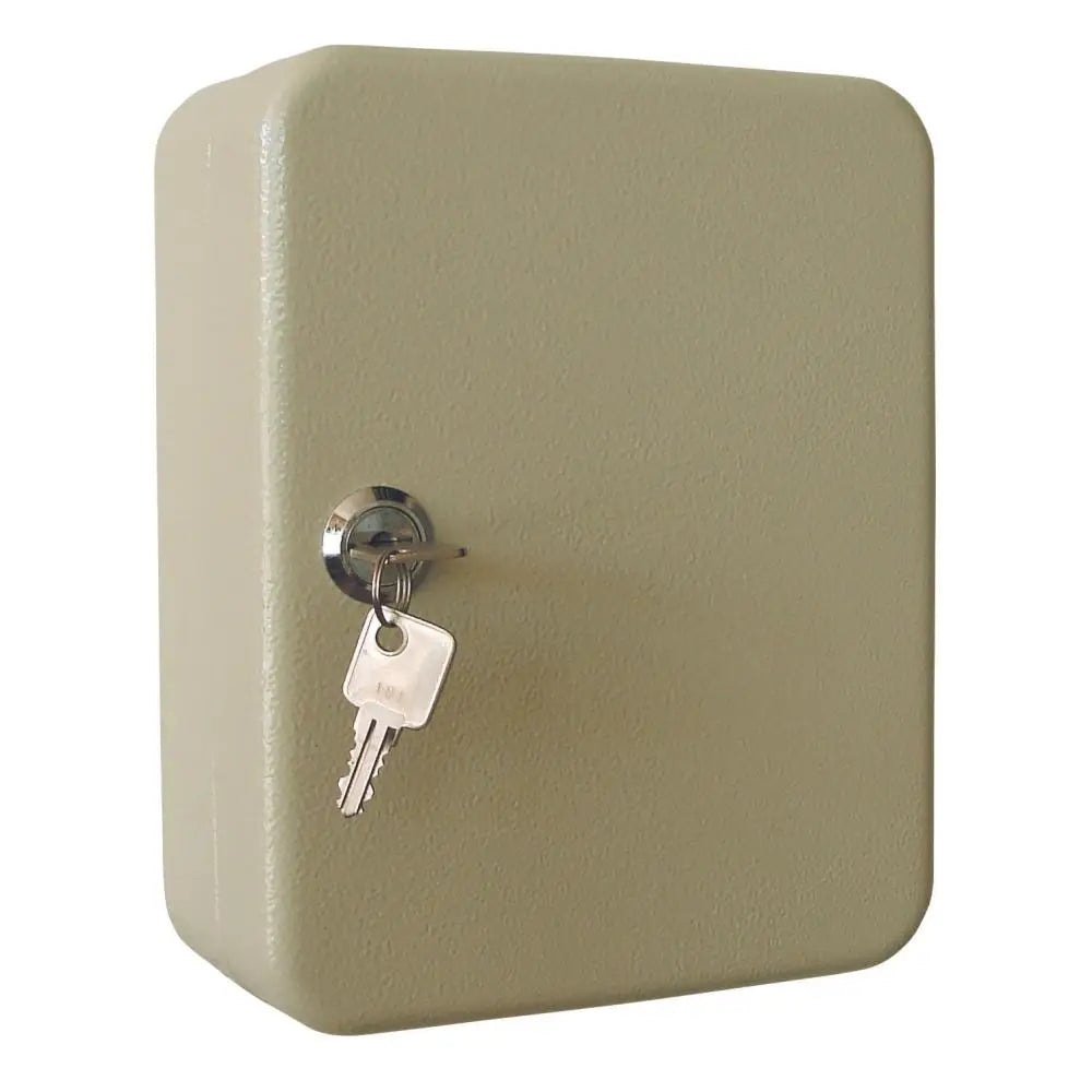 Nyckelskåp med upphängningskrokar. I stålplåt med rundade hörn, epoxylackerat i ljust gråbeige och med högerhängd dörr. Levereras med nyckelbrickor och 2 nycklar till cylinderlåset.