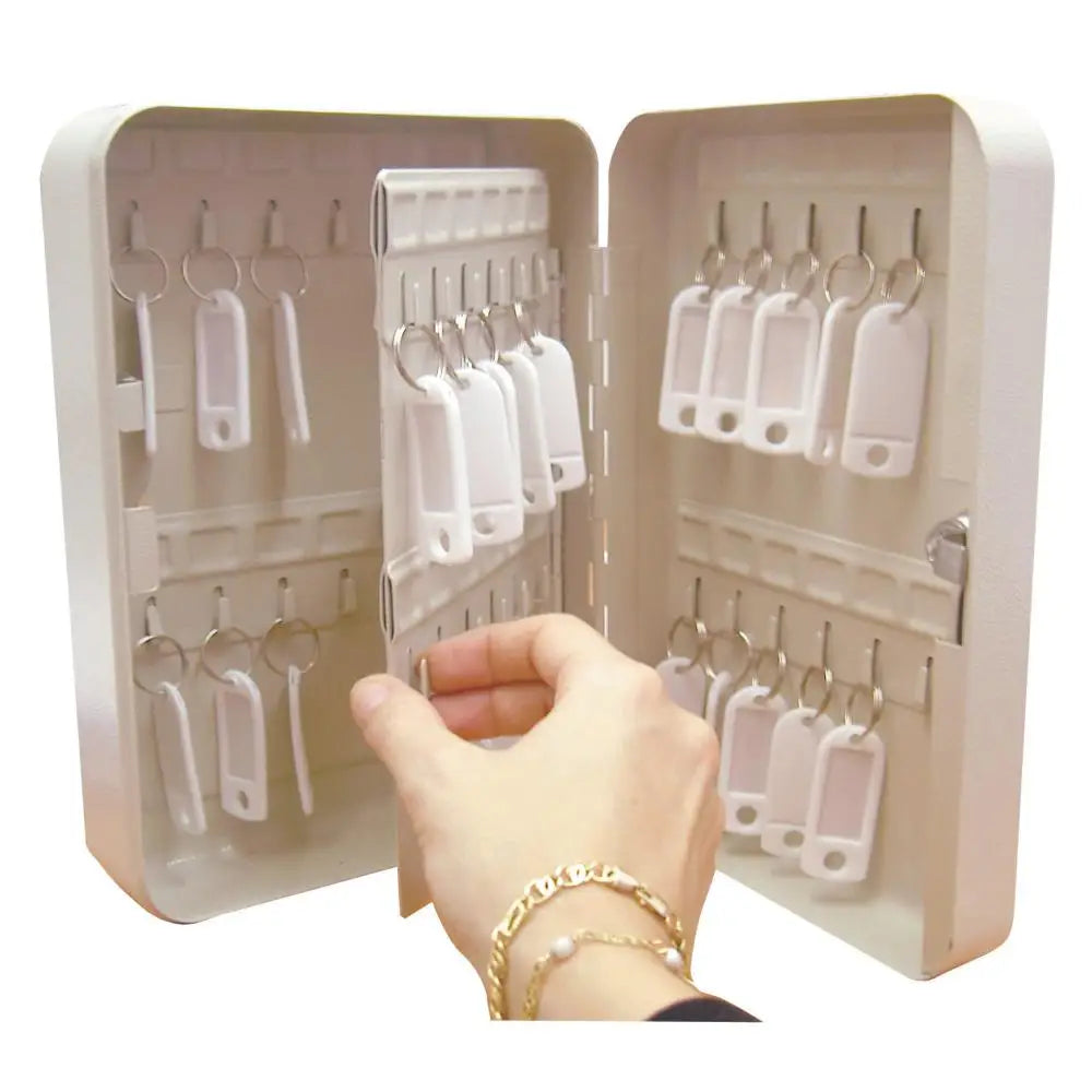 Nyckelskåp med upphängningskrokar. I stålplåt med rundade hörn, epoxylackerat i ljust gråbeige och med högerhängd dörr. Levereras med nyckelbrickor och 2 nycklar till cylinderlåset.