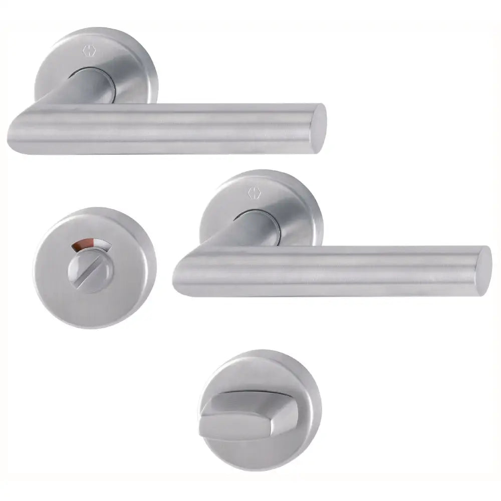 Dörrhandtag innerdörr. Komplett set med handtag och WC-vred med röd/vit markering, för dörrtjocklek 37-42 mm. Med HOPPE Kvick-i-Sprint fastsättning. 10 års funktionsgaranti. Förpackning kartong.
