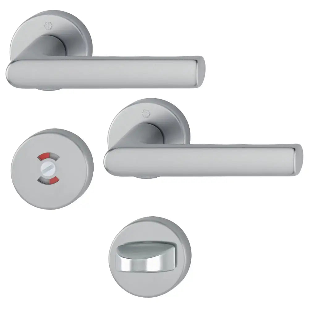 Dörrhandtag med HOPPE Kvick-i-Sprint fastsättning. Innerdörrstrycke, för dörrtjocklek 37-42 mm. Komplett set med handtag, rosett och nyckelskylt/WC-skylt inkl skruv. Med den unika Kvick-i-Sprint fastsättningen blir montaget stabilare och behöver inte heller återskruvas efter montage. 10 års funktionsgaranti.
