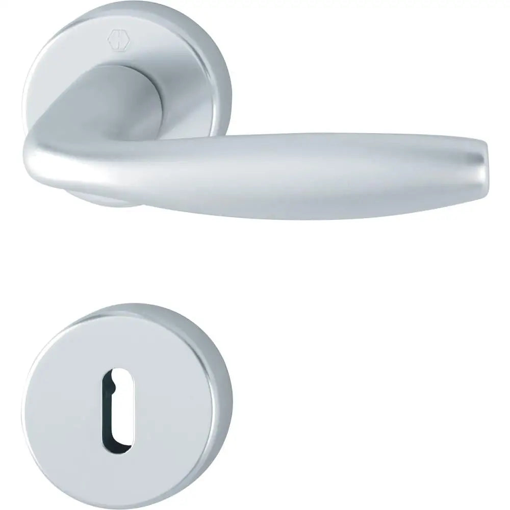 Dörrhandtag med HOPPE Kvick-i-Sprint fastsättning. Innerdörrstrycke, för dörrtjocklek 37-42 mm. Komplett set med handtag, rosett och nyckelskylt inkl skruv. Med den unika Kvick-i-Sprint fastsättningen blir montaget stabilare och behöver inte heller återskruvas efter montage. 10 års funktionsgaranti. SB-förpackad.