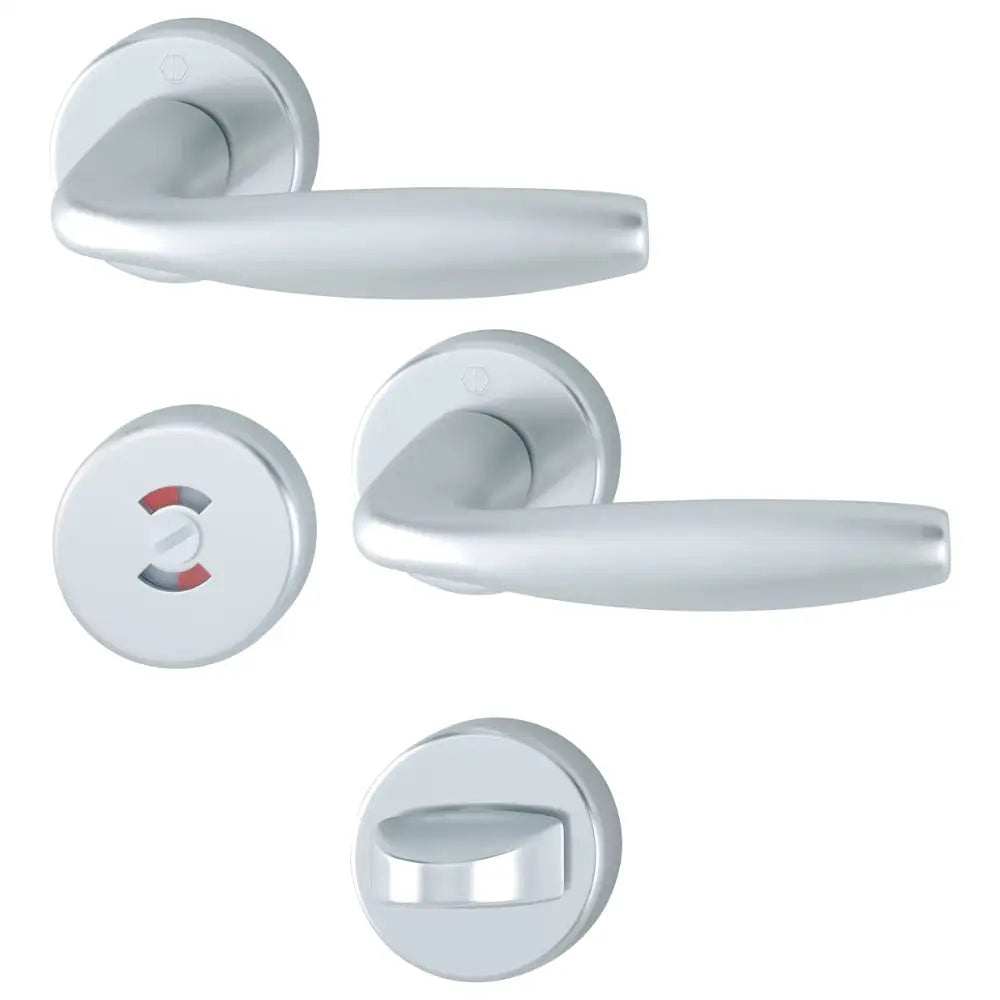 Dörrhandtag innerdörr. Komplett set med handtag, rosett och WC-behör inkl skruv, för dörrtjocklek 37-42 mm. Med HOPPE Kvick-i-Sprint fastsättning. 10 års funktionsgaranti. SB-förpackad.