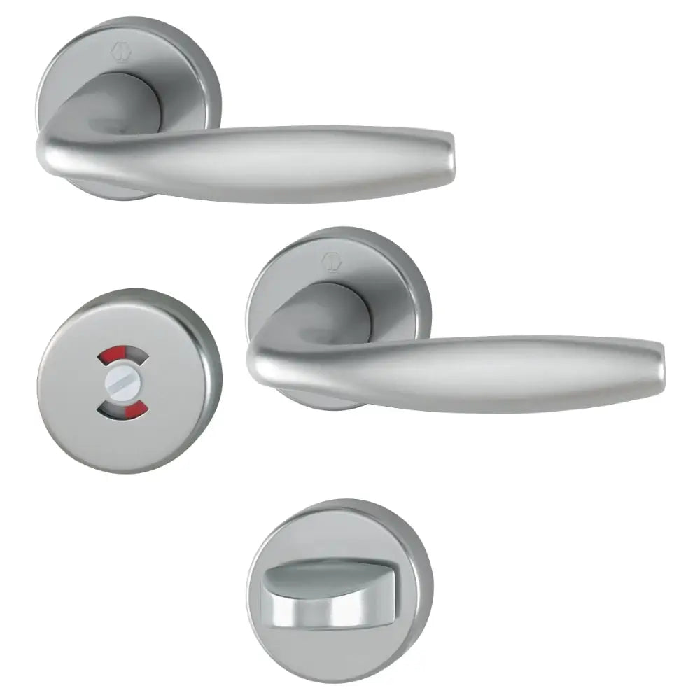 Dörrhandtag innerdörr. Komplett set med handtag, rosett och WC-behör inkl skruv, för dörrtjocklek 37-42 mm. Med HOPPE Kvick-i-Sprint fastsättning. 10 års funktionsgaranti. Styck-förpackad.