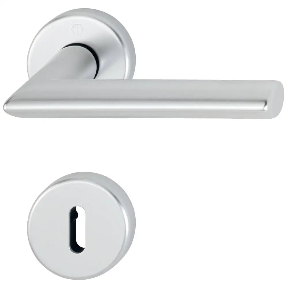 Dörrhandtag med HOPPE Kvick-i-Sprint fastsättning. Innerdörrstrycke, för dörrtjocklek 37-42 mm. Komplett set med handtag, rosett och nyckelskylt inkl skruv. Med den unika Kvick-i-Sprint fastsättningen blir montaget stabilare och behöver inte heller återskruvas efter montage. 10 års funktionsgaranti. SB-förpackad.