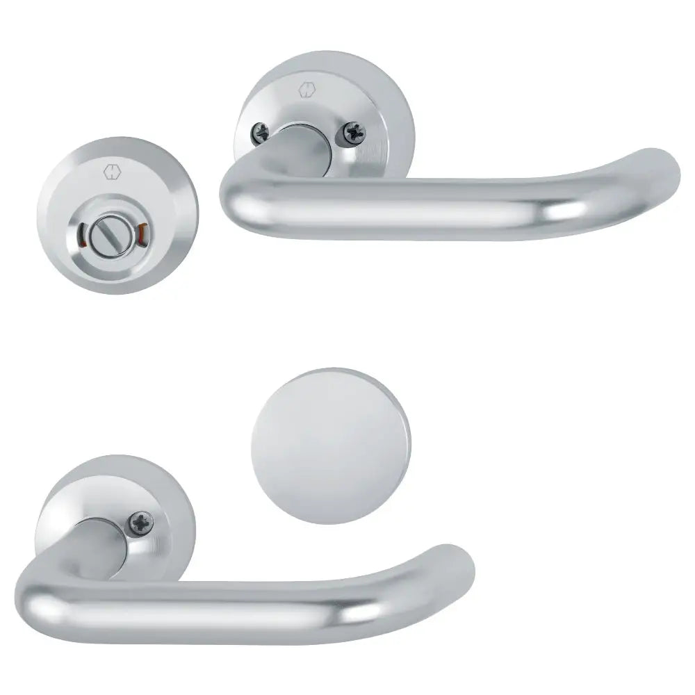 Handikappanpassade WC-behör med flip-up funktion. Man låser från insidan genom att lyfta handtaget upp och låser upp igen genom att trycka handtaget nedåt. WC-behöret är vändbart höger/vänster. Passar dörrtjocklek 37-62 mm. Nickelfria, testade enligt gällande EU-direktiv. För lås 310 och 565.