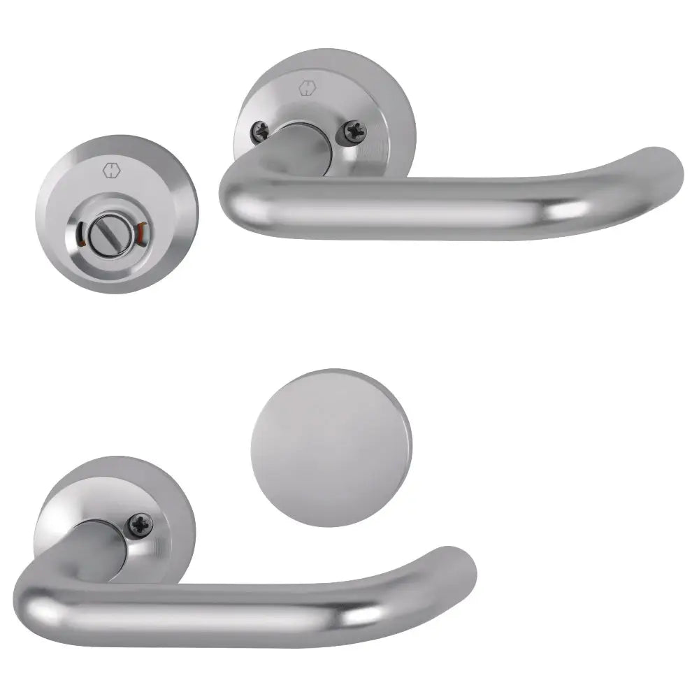 Handikappanpassade WC-behör med flip-up funktion. Man låser från insidan genom att lyfta handtaget upp och låser upp igen genom att trycka handtaget nedåt. WC-behöret är vändbart höger/vänster. Passar dörrtjocklek 37-62 mm. Nickelfria, testade enligt gällande EU-direktiv. För lås 310 och 565.