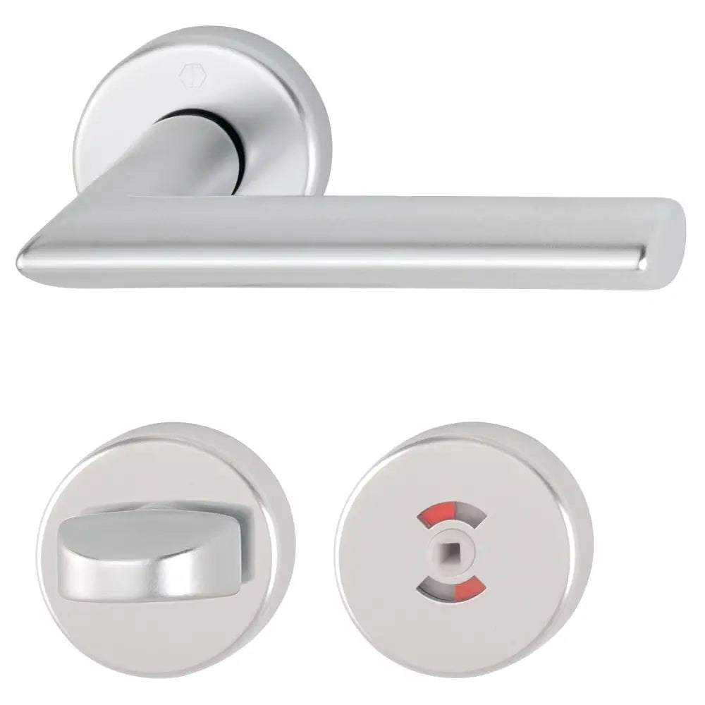 Dörrhandtag med HOPPE Kvick-i-Sprint fastsättning. Innerdörrstrycke, för dörrtjocklek 37-42 mm. Komplett set med handtag, rosett och WC-skylt inkl skruv. Med den unika Kvick-i-Sprint fastsättningen blir montaget stabilare och behöver inte heller återskruvas efter montage. 10 års funktionsgaranti. SB-förpackad.