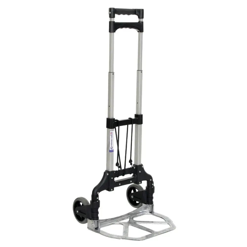 Lätt och smidig bagagekärra i aluminium för laster upp till 60 kg. Hjul och lastplan fälls in samtidigt vilket gör att kärran tar minimalt med plats vid förvaring och transport. Fälg: Plast. Hjullager: Kullager. Spårvidd: 360 mm. Leveransutförande: Monterad. Totalmått: H1000xB400xD400 mm. Mått hopfälld: H640xB390xD60 mm. Lastplan: D270xB380 mm. Hjul: Punkteringsfritt. Hjuldimension: 125x30 mm.
