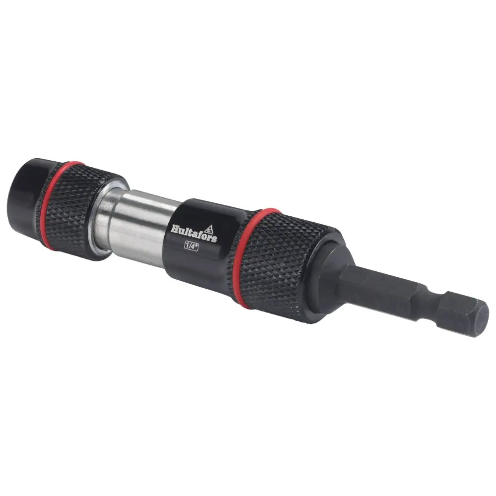 1/4" ledbar magnetisk bitshållare med snabbfäste, utvecklad för professionellt bruk. En kulled tillåter att skruvar kan dras åt i en vinkel upp till 20 grader och används med fördel i trånga utrymmen. Genom att förflytta hylsan kan bitshållaren användas som en standard-bitshållare. Snabbfästet gör det möjligt att sätta i en bits med ett enhandsgrepp utan att behöva dra hylsan bakåt. Den frispinnande svarta hylsan är lätt att hålla i för att stabilisera bitset medan man skruvar.