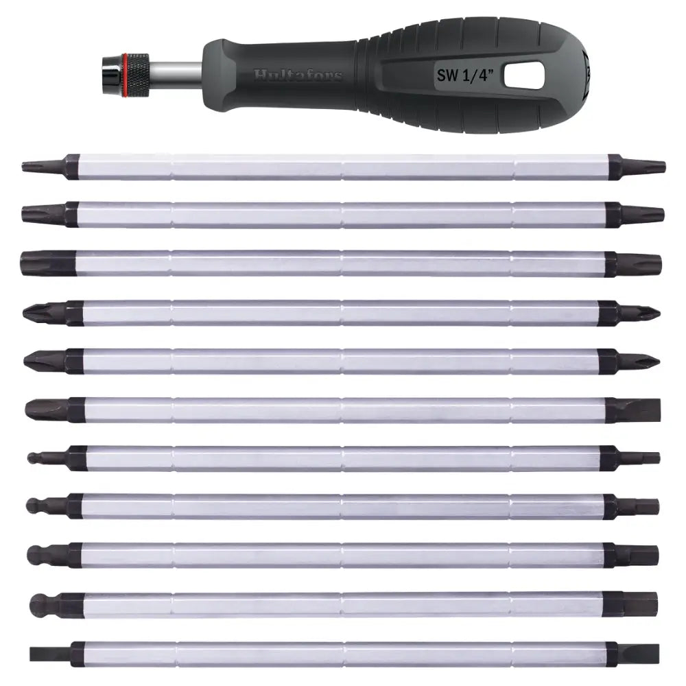 Set med långa bits och handtag i ett praktiskt tygfodral. Utvecklat för professionellt bruk tillsammans med hantverkare. Längden på bitsen kan justeras genom att de skjuts in i handtaget. Innehåller spårbits 4, 5.5 och 6.5, PH 1, 2 och 3, PZ 1 och 2, insex med kulspets 3, 4, 5 och 6 mm samt TORX T10, 15, 20, 25, 30 och 40.