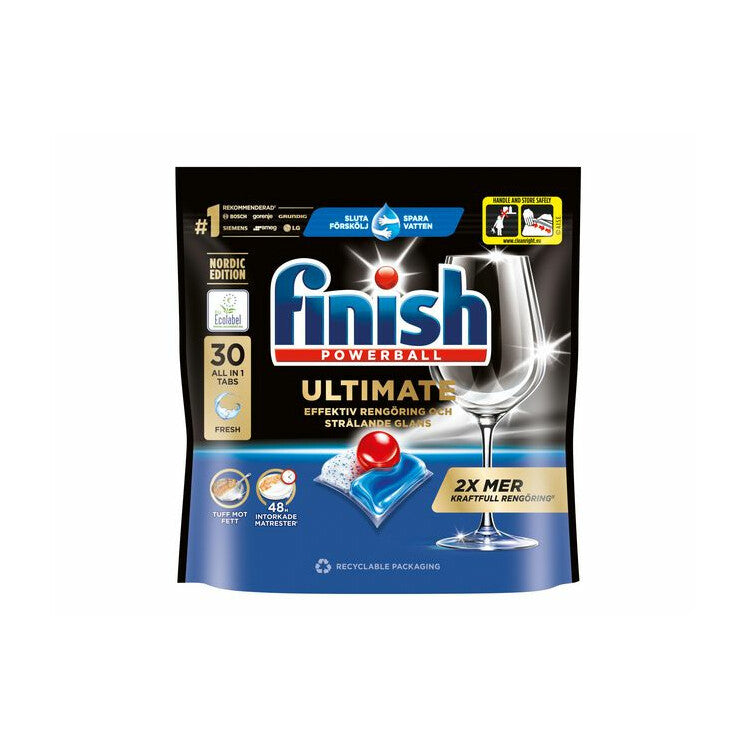 Finish Power All In One (AiO) Disktabletter 30-Pack erbjuder en allt-i-ett-lösning för diskmaskinen. Dessa tabletter kombinerar flera funktioner – diskmedel, avkalkning och glasrengöring – i en enda tablett. De är designade för att lösa upp fett, ta bort smuts och skydda diskmaskinen från kalkavlagringar, vilket ger glänsande ren disk vid varje användning.