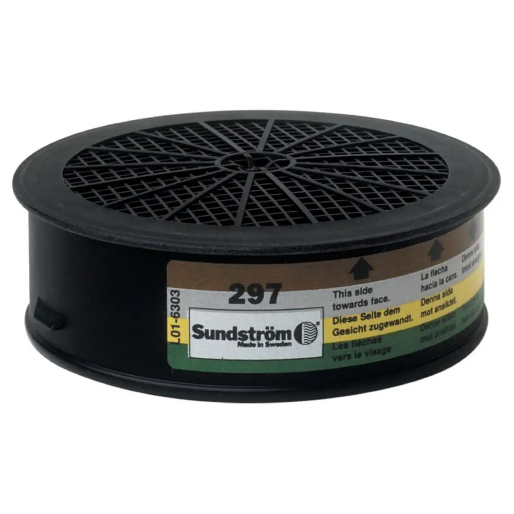 Gasfilter SR 297, klass 1, är avsett för användning tillsammans med Sundströms halv- och helmasker. Filtret är av typ ABEK och skyddar mot följande typer av gaser/ångor: Typ A skyddar mot organiska gaser och ångor, lösningsmedel, vars kokpunkt överstiger +65 °C. Typ B skyddar mot oorganiska gaser och ångor, t ex klor, svavelväte och cyanväte. Typ E skyddar mot sura gaser och ångor, t ex svaveldioxid och fluorväte. Typ K skyddar mot ammoniak och vissa aminer, t ex etylendiamin. Gasfiltren kan enkelt kombineras med partikelfilter SR 510 P3 R, för att erhålla skydd även mot aerosoler (partiklar), t ex vid sprutmålning.