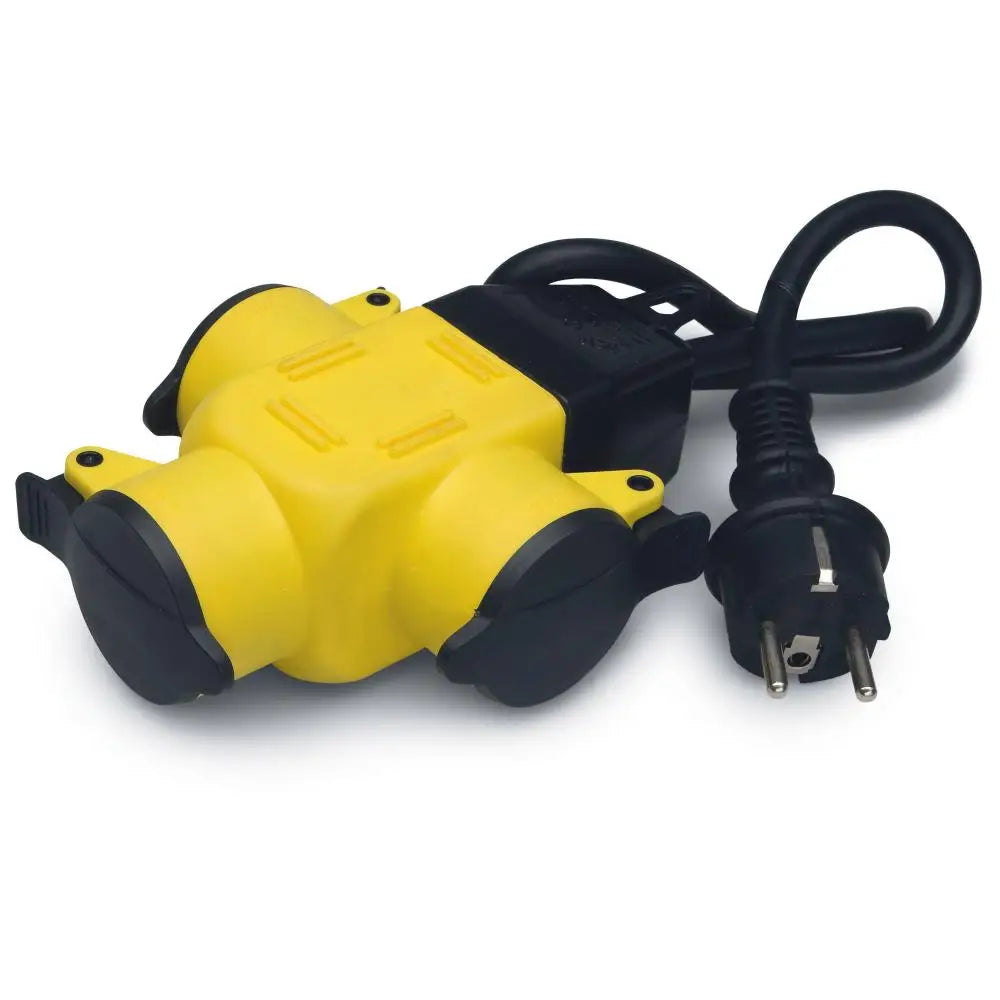 Jordat trevägs grenuttag. Grenuttaget är försett med självstängande lock. Kapslingsklass IP44. Uttagen har en gummiring som sluter tätt mot stickproppen. Detta kräver större kraft vid isättning av stickproppen.