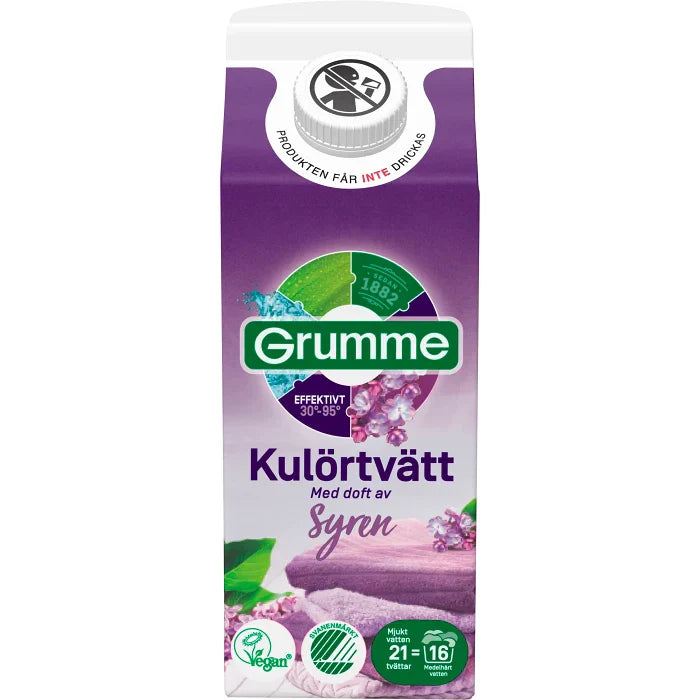 Grumme Flytande Kulörtvätt Syren 750ml är ett tvättmedel som skonsamt rengör och bevarar färgerna på dina kulörta kläder. Den milda formulan, berikad med en ljuvlig doft av syren, tar effektivt bort smuts och fläckar samtidigt som den skyddar färgerna och ger en fräsch känsla.