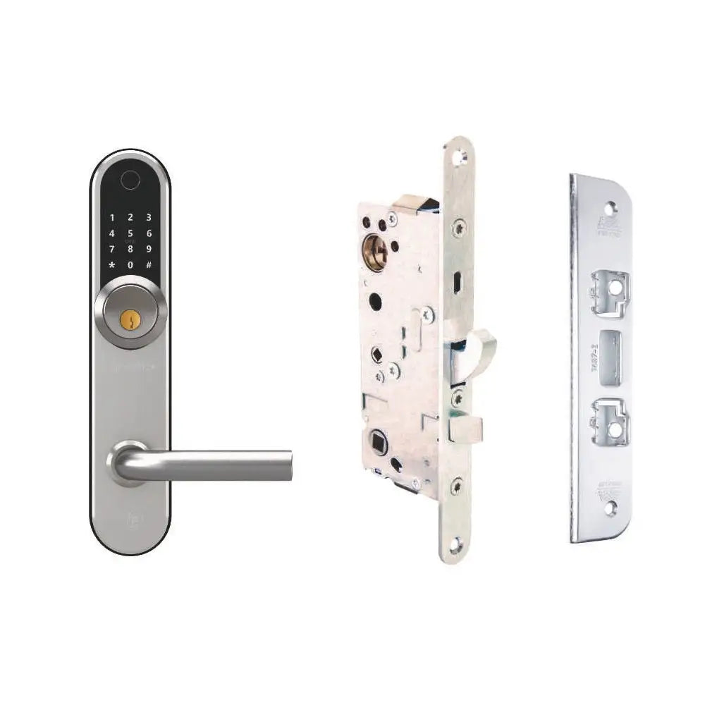 Nordic+ digitalt ytterdörrslås med fingeravtrycksavläsning och medföljande låshus.