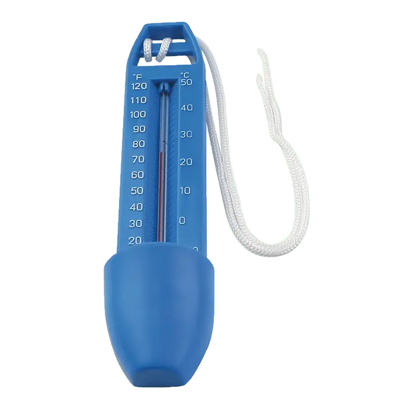 En praktisk termometer för pool och spabad, utformad för enkel avläsning av vattentemperaturen. Med det medföljande snöret kan den fästas vid poolkanten eller annan önskad plats, vilket gör den lättillgänglig vid behov.