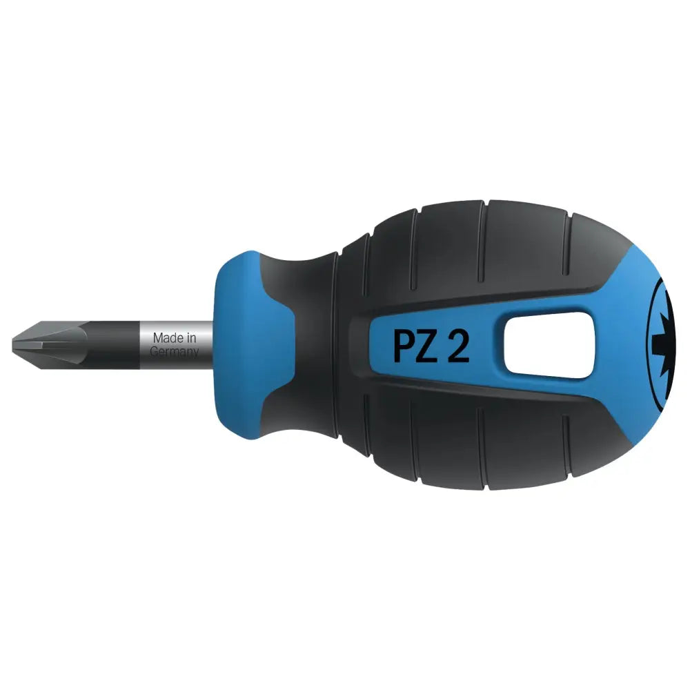 Pozidrivmejsel med kort klinga och kompakt handtag för bättre åtkomst i trånga utrymmen. Utvecklad för professionellt bruk tillsammans med hantverkare. Handtaget är tillverkat i tålig PPC-plast med ett överdrag av åldersbeständigt och greppvänligt gummi. Skruvmejselns handtag har hål för upphängning eller verktygssäkring. Handtagets utformning förhindrar skruvmejseln att rulla på lutande yta.