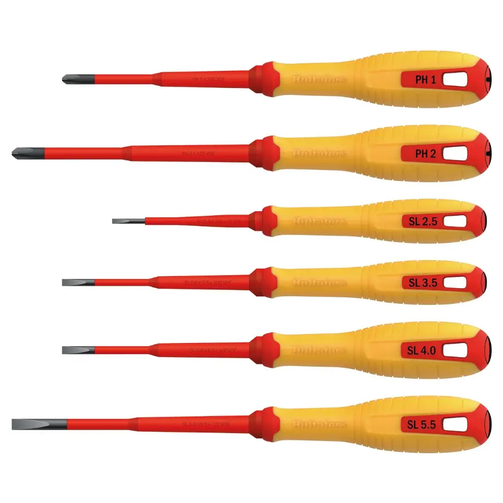 VDE-set med 6 st skruvmejslar, utvecklade för professionellt bruk tillsammans med hantverkare. Innehåller PH 1 och 2 samt spårmejsel 2.5, 3.5, 4 och 5.5. Isolerad klinga med extra smal design för bättre åtkomst i trånga utrymmen. Alla skruvmejslar är testade och certifierade enligt IEC 60900 för arbete upp till 1000 V.