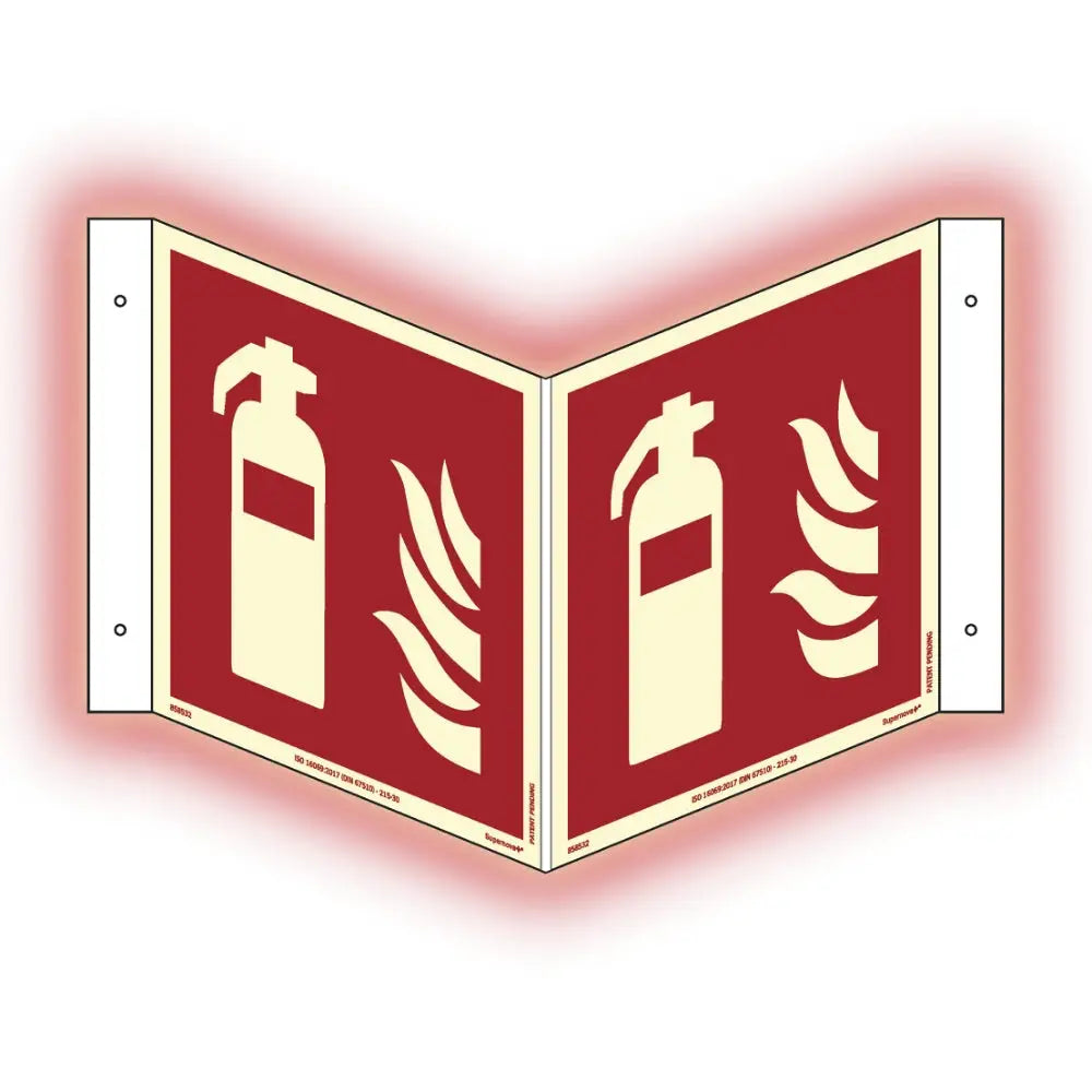 Skylt brandsläckare plogskylt. Material: Aluminium. Yta: Supernova+. Färgefterlysande skylt med ultrastark lyskraft i mörker. Godkänd enligt ISO 3864, ISO 7010 samt överskrider ISO 16069 vad gäller luminans.