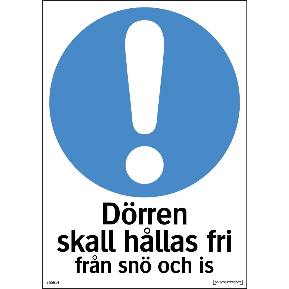 Skylt "Dörren skall hållas fri från snö och is". Material: Plast. Yta: Tryck.