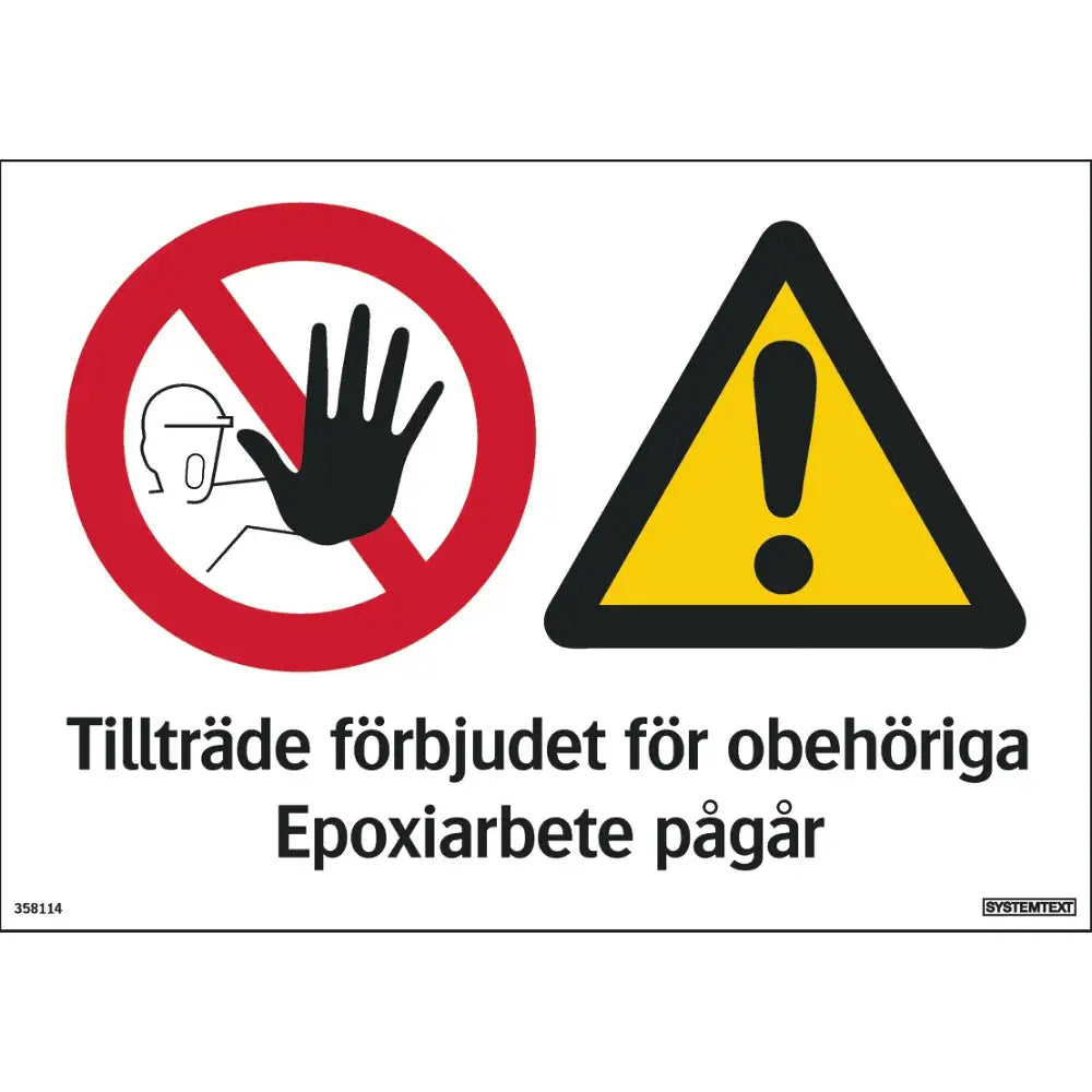 Skylt Tillträde förbjudet för obehöriga Epoxiarbete pågår. Material: Hårdplast. Yta: Tryck.