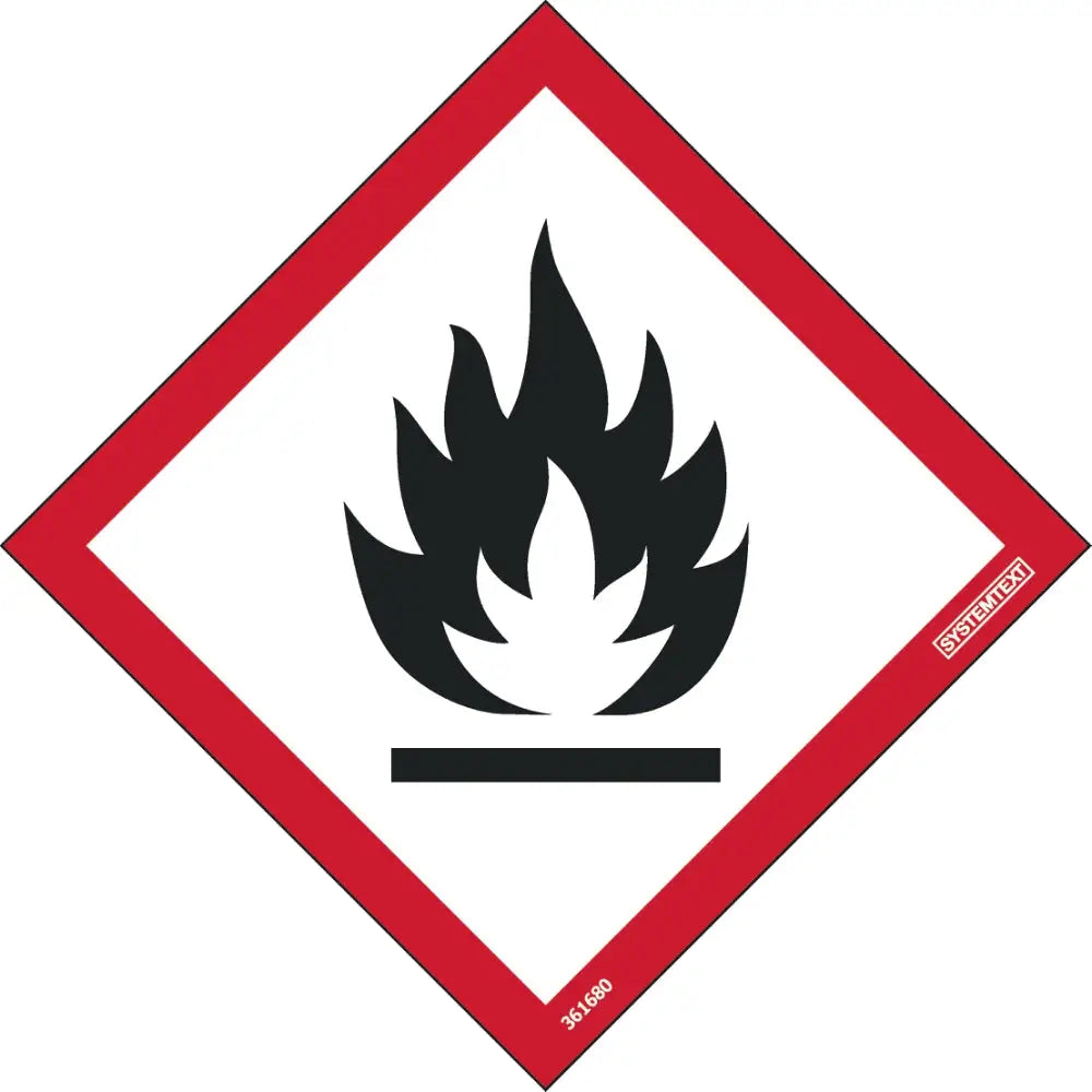 Skylt Faropiktogram CLP Brandfarlig GHS02. Tillämpning: Vägg. Material: Dekal. Yta: Tryck.