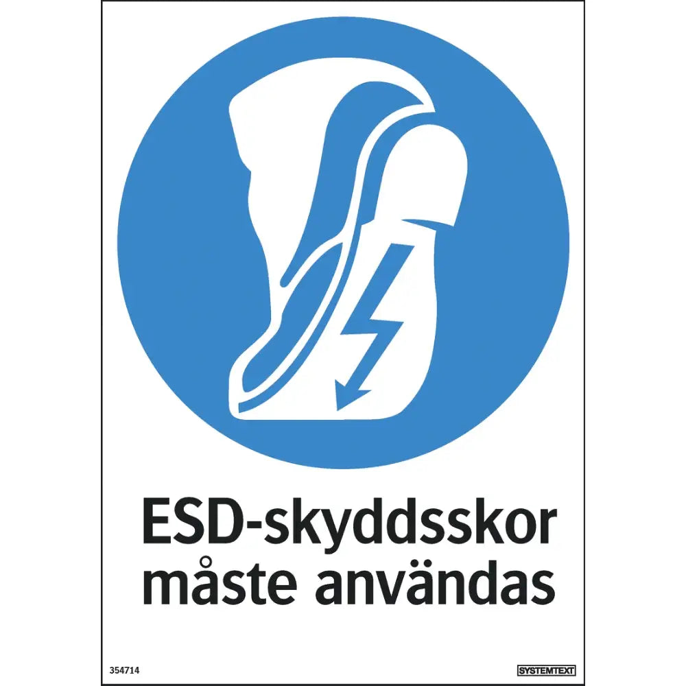 Skylt Antistatiska skyddsskor måste användas. Material: Hårdplast. Yta: Tryck.