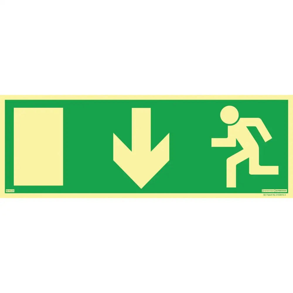 Skylt utrymning pil ner. Material: Aluminium. Yta: Supernova. Skylten efterlyser i mörker med hela sitt budskap.