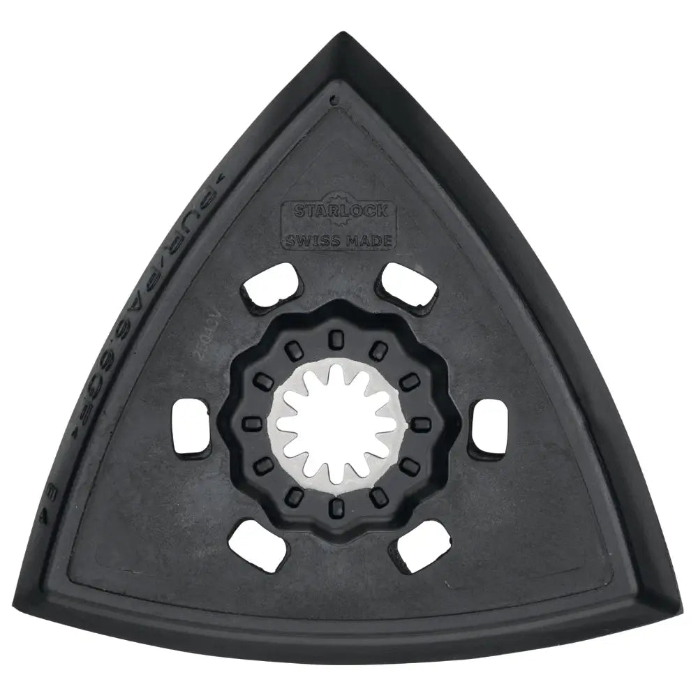 Utformad för effektiv slipning med dammutsug och en plastbaksida som skyddar arbetsstycken. Den trekantiga, perforerade designen har en kardborreplatta för slippapper.