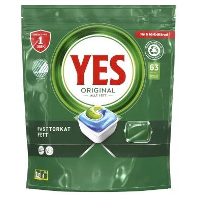Yes Maskindisktabletter All in One Original erbjuder en komplett och effektiv lösning för din diskmaskin. Dessa all-in-one disktabletter är utformade för att lösa fett, smuts och matrester, och ge ett glänsande resultat varje gång. Med Yes All in One får du en tablett som både rengör och skyddar din diskmaskin, och lämnar din disk fräsch och skinande.