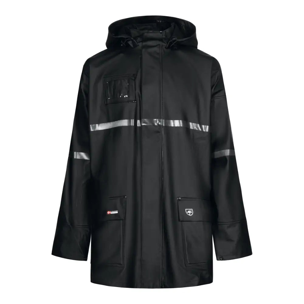 Regnjacka med stor avtagbar hjälmhuva med dragsko. Dold bröstficka, ID-kortsficka, framfickor med tryckknappar. Dold dragkedja med tryckknappar, ventilation i ryggen. Svarta reflexdetaljer. Vind och vattentät. Vattentäthet: >20.000 mm.