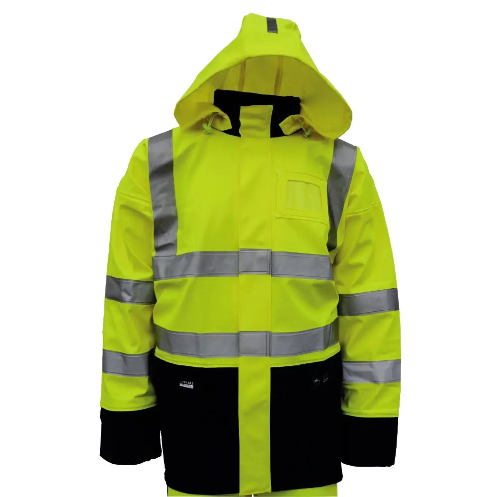 Hi-Viz regnjacka, avtagbar huva med tryckknappar. Stor huva med dragsko som ryms över hjälmen. Innerficka med dragkedja. ID-kortsficka, framfickor med tryckknappar. Dold dragkedja under frontslå, ventilation i ryggen. Vind och vattentät. Material: 50% polyester, 25% polyurethan, 25% PVC, 350 g/m2. Vattentäthet: 13.000 mm.