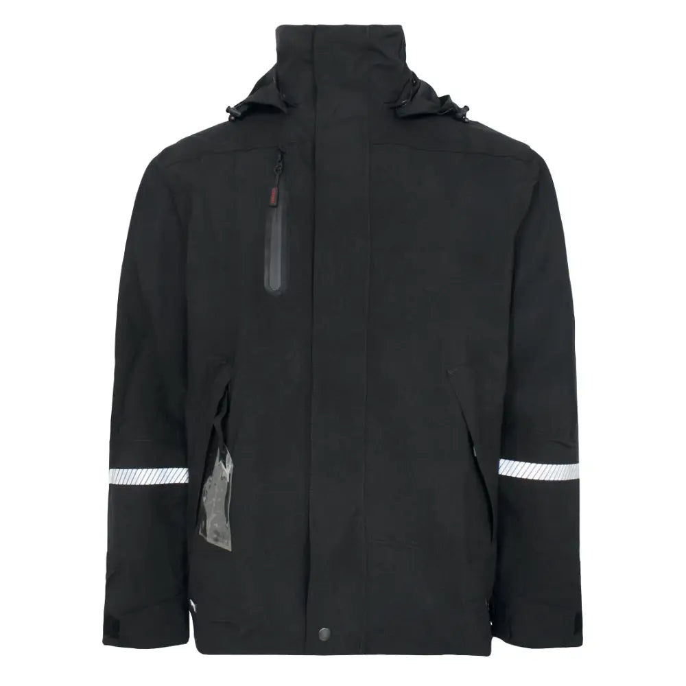 Regnjacka i stretch. Avtagbar huva. Dold dragkedja med kardborreslutning. Kardborrejustering vid ärm. Bröstficka och sidfickor med dragkedja. Fleecefoder i halsen. Innerfickor och mobilficka. Avtagbar ID-kortshållare. Reflexer. Andningsbar, vind och vattentät med tejpade sömmar.