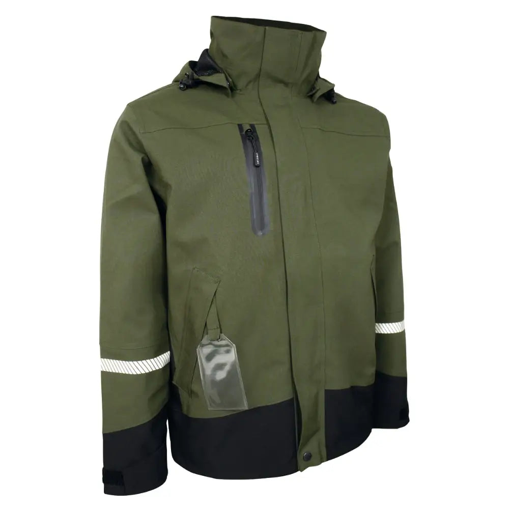 Regnjacka i stretch. Avtagbar huva. Dold dragkedja med kardborreslutning. Kardborrejustering vid ärm. Bröstficka och sidfickor med dragkedja. Fleecefoder i halsen. Innerfickor och mobilficka. Avtagbar ID-kortshållare. Reflexer. Andningsbar, vind och vattentät med tejpade sömmar.