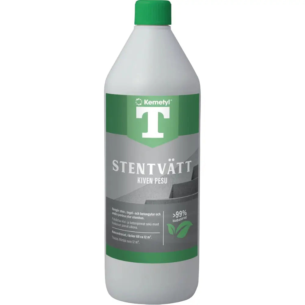 T-Stentvätt Kemetyl är ett kraftfullt rengöringsmedel för sten- och betongytor utomhus. Produkten avlägsnar smuts, alger och beläggningar och är idealisk för användning på parksten, trädgårdsplattor, putsade fasader och husgrunder.